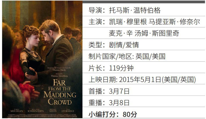 经典重温 《远离尘器》 剧情简介: 故事发生在维多利亚时代的英国,彼时田园牧歌式的封建宗法制社会遭到资本主义的重创,濒临瓦解。美丽的少女巴斯希巴继承了姑姑的农场,成为农场主,有为青年加里布埃尔爱上了巴斯希巴,来到她的农场打工。然而,巴斯希巴却并没有将老实的加里布埃尔放在眼里,她疯狂的爱慕着一个名为特洛伊的花花公子,虽然特洛伊曾经残忍地抛弃了纯洁的少女范尼,但巴斯希巴还是盲目地相信这个男人