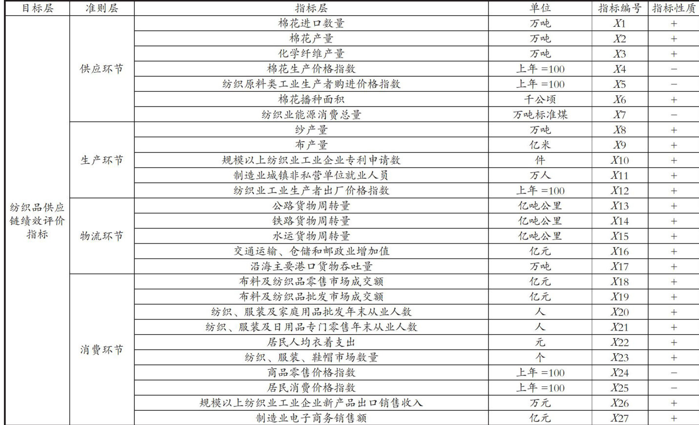 摘要:文章围绕我国纺织品供应链绩效评价展开,致力于建立一套科学全面的评价体系。基于纺织品供应链“供应、生产、物流、消费及信息化”的全链条运作特点,通过分析行业特性初步选取31项评价指标,经相关性分析与变异系数筛选后,最终保留23项核心指标,形成包含5个准则层的三级指标体系。采用熵权法计算指标权重后发现,供应环节、消费环节及信息化水平对供应链绩效的影响最为突出。研究证实,该评价体系可有效量化纺织品供应链各环节的运作效率,为优化供应链管理、增强产业竞争力提供了客观参考。