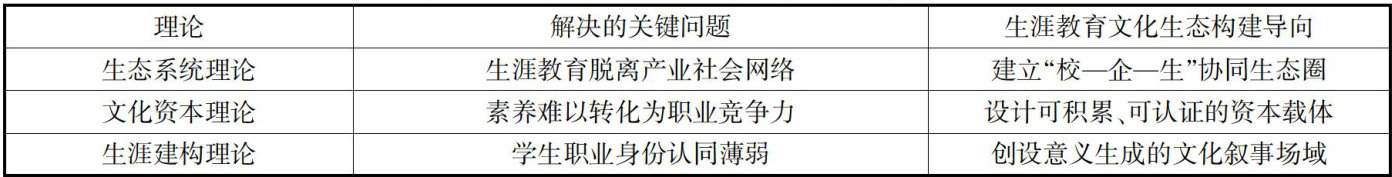 摘要:在新质生产力驱动产业变革的背景下,高职生涯教育面临文化生态缺位的现实困境,具体表现为教育内容工具化、课程体系碎片化与实践载体单一化。该研究基于生态系统理论、文化资本理论与生涯建构理论,构建“价值理念—制度规范—行为实践—物质载体”四维融合的生涯教育文化生态体系。针对高职三年学制特征,创新性提出辅导员主导的“三阶赋能”模式:大一阶段破除工具化认知,植入新质生产力价值观;大二阶段培养“技术 + 创新”复合能力;大三阶段实现产业文化适应与终身学习生态位构建。通过辅导员角色转型、虚实载体协同及动态监测机制,为高职教育回应新质生产力人才需求提供系统性路径。