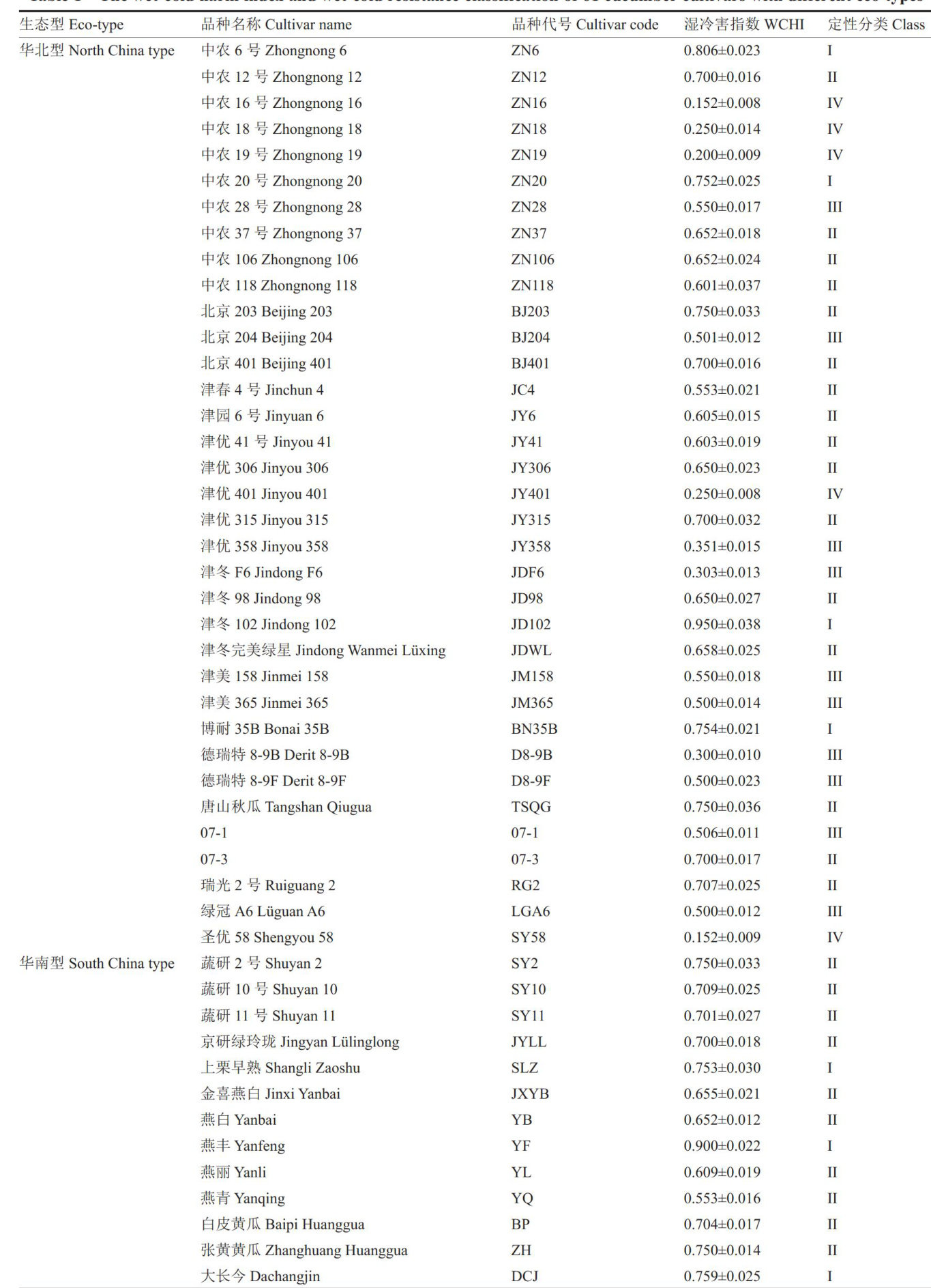 摘要:为明确黄瓜品种耐湿冷特性,采用湿冷害指数和耐湿冷值预测方程两种方法分别对3个生态型61个黄瓜品种进行耐湿冷性鉴定。结果表明,61个品种湿冷害指数最大值为0.950,耐湿冷值最小值为0.127,均为华北型品种津冬102;湿冷害指数最小值为0.103,耐湿冷值最大值为1.408,均为欧洲温室型品种迷你3号。湿冷害指数均值为0.579,变异系数为 67.88% ;耐湿冷值均值为0.578,变异系数为 51.43% 。湿冷害指数越大,耐湿冷值越小,品种耐湿冷性越差。两种方法鉴定的量化结果高度一致,从不同角度反映了品种的耐湿冷特性。按照湿冷害指数和耐湿冷值定性分类,均可把61个品种分为湿冷敏感型、弱耐湿冷型、中耐湿冷型和强耐湿冷型4类,湿冷害指数各类分别有8、32、14和7个品种,耐湿冷值各类分别有9、36、10和6个品种,结果基本一致。黄瓜品种耐湿冷特性与生态型有关,欧洲温室型和华北型中不同程度耐湿冷性品种均有,但欧洲温室型黄瓜中耐和强耐湿冷型品种比例较高,华南型均为湿冷敏感型和弱耐湿冷型。本研究结果可为黄瓜耐湿冷育种和栽培中品种选择提供依据。