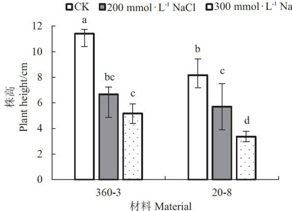 摘要:为探究盐胁迫对南瓜生长发育的生理调控机制,本研究选取耐盐性差异显著的两个南瓜品系(360-3、20-8)为试材,通过幼苗期盐胁迫试验,系统分析其生理响应特征。试验设置 0(CK),200,300mmol?L-13 个 NaCl 浓度梯度,分析盐胁迫对南瓜幼苗生长、生理代谢及抗氧化酶活性的影响。结果表明,随着 ΔNaCl 浓度升高,两份南瓜材料的幼苗株高显著降低,其中20-8的降幅更为显著。叶片相对含水量(RWC)和干鲜质量随盐浓度增加呈下降趋势,但耐盐品系360-3的RWC在盐胁迫下维持稳定,显著优于20-8。盐胁迫加剧细胞膜损伤,两份南瓜材料的电导率随盐浓度升高显著上升。抗氧化酶活性响应中,360-3在300 mmol·L'NaCI处理下超氧化物歧化酶(SOD)、过氧化物酶(POD)和过氧化氢酶(CAT)活性较对照 (0mmol?L-1NaCl) 分别显著提高 230.91%?284.72%?40.82% ,远高于20-8的 103.03%.24.96%.22.89% 。两份南瓜材料在 300mmol?L-1NaCl 处理下的过氧化氢 (H2O2) 含量较对照分别显著升高 37.07% 和 39.95% ,表明抗氧化系统能有效缓解氧化损伤。综上,材料20-8耐盐性差,而材料360-3通过更强的保水能力和抗氧化酶激活机制表现出更强的耐盐性。