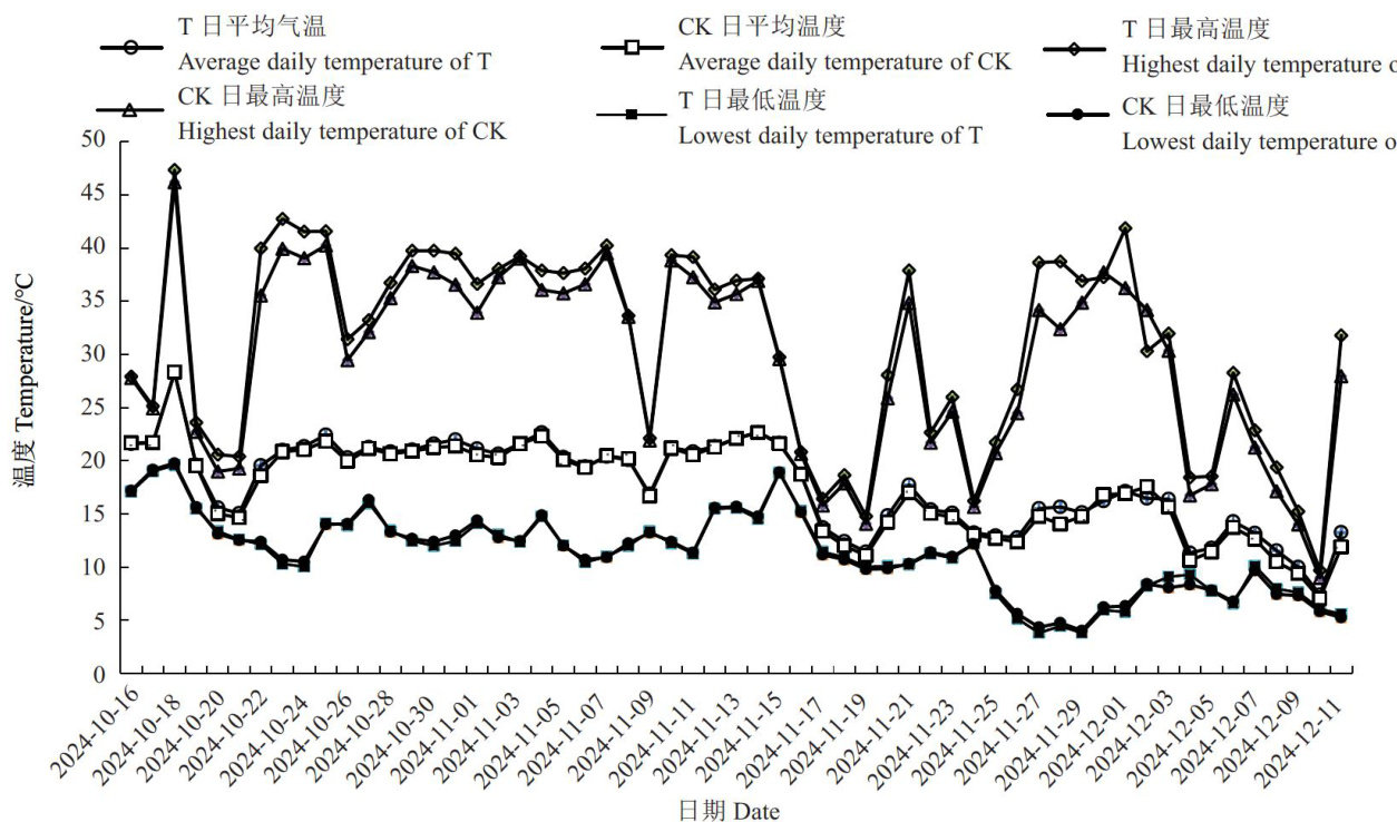摘要:为探究转光膜在洞庭湖区秋延后辣椒生产中对大棚温光环境的调控效应及其对辣椒生长生理的影响,评估其在高温季节的适用性,本研究以辣椒品种常辣60为材料,设置转光膜覆盖(T)和普通PO膜覆盖(CK)两种处理,对比分析棚内温光环境、辣椒农艺性状及生理指标的变化。结果表明,转光膜明显提升棚内日最高温度(峰值增幅6.34°C ,降低日最高光照强度 53733.71k 及日平均湿度 4.80% ,但日均温无明显变化,呈现“增峰不增均"的温光调控特征;转光膜覆盖促进辣椒果实纵向发育(果纵径增加 9.81% ,由于高温胁迫的抵消效应导致单果质量无显著提升;生理机制上,转光膜覆盖导致叶片MDA含量剧增 179.07% ,表明高温胁迫诱导氧化损伤,而CAT活性未显著变化,提示抗氧化系统响应不足。本研究结果表明,转光膜在高温季节会加剧棚内热胁迫,限制辣椒产量形成,因此不建议在高温期直接单独应用此类明显提升峰值温度的转光膜,高温期应用需协同降温技术以规避热损伤风险,为优化区域设施辣椒栽培环境提供理论依据。