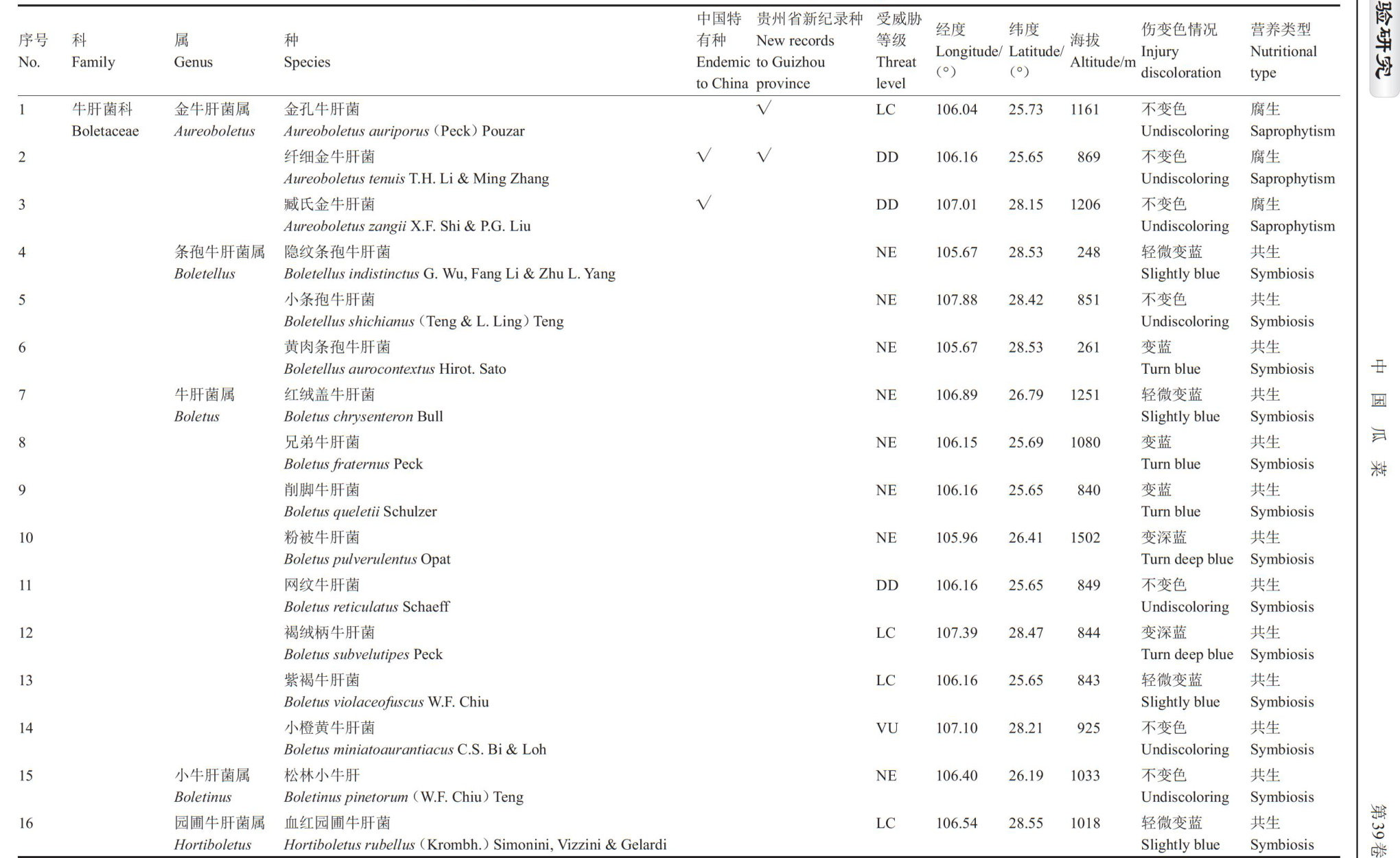 摘要:大娄山区和黔中山原山地地形复杂,海拔差异大,植被类型丰富,为牛肝菌的生长提供了良好的生态环境。为进一步明确此区域牛肝菌目物种多样性,通过样方和踏查法对大娄山区和黔中山原山地的牛肝菌自资源进行调查,共采集样本365份。结合形态学和分子系统学对采集到的标本进行鉴定,共鉴定出该区牛肝菌目真菌资源8科30属73种,包括中国特有种10个,贵州新纪录种13个。优势科为牛肝菌科(Boletaceae),占总种数的 71.23% 。优势属有乳牛肝菌属(Suillus)和牛肝菌属(Boletus)等5个属,占总种数的 45.21% 。区域内食用菌有24种、药用菌3种、食药兼用菌6种、有毒菌19种;对49种牛肝菌目真菌进行了受威胁等级评估,其中包括近危物种(NT)1种、易危物种(VU)1种。研究结果初步明确了大娄山区和黔中山原山地牛肝菌目真菌的物种多样性特征及其资源状况,为后续保护、开发和利用牛肝菌目真菌资源提供了理论基础。