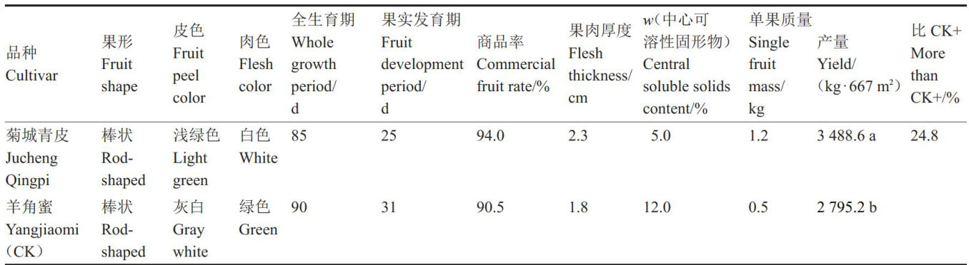 摘要:菊城青皮是以KT135为母本、KT152为父本配置而成的杂交1代菜瓜型薄皮甜瓜新品种。该品种在河南省春季露地爬地栽培模式下全生育期85d,果实发育期25d,早熟性好。植株长势稳健,苗期耐低温耐弱光性好,坐果能力强,果实棒状,果皮浅绿色,果肉白色,果白色,表面光滑,外形美观,商品率高。单瓜质量 1.2kg 左右,平均667m2 产量 3500kg 。单瓜种子数量330粒左右,种子小、黄白色。中心可溶性固形物含量 (w)5% ,口感酥脆爽口,生食、凉拌、腌渍及烹炒俱佳。适合在河南省及相近生态区进行春季栽培。2024年12月通过农业农村部非主要农作物品种登记。