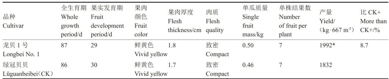 摘要:龙贝1号是以H2017-41-1为母本、H2017-40-3为父本配置而成的杂交1代贝贝型南瓜新品种。该品种早熟,在黑龙江省春季棚室栽培果实发育期 29d 左右,全生育期 87d 植株长势健壮,分枝性强,叶片浓绿,坐果性突出。果实扁圆形,外观靓丽,商品性佳;果皮黑绿色,果线细长、浅绿色,果肉黄色,平均果肉厚度 1.8cm ,品质佳,软糯香甜,平均干物质含量 (w)21% ,总糖含量 8.34% ,可溶性固形物含量 10.7% 。单果质量 0.6kg 左右,连续坐果能力强,中抗病毒病。棚室栽培 667m2 产量 1887kg 左右,耐贮运性好。该品种适应性强,适于全国各地保护地栽培。