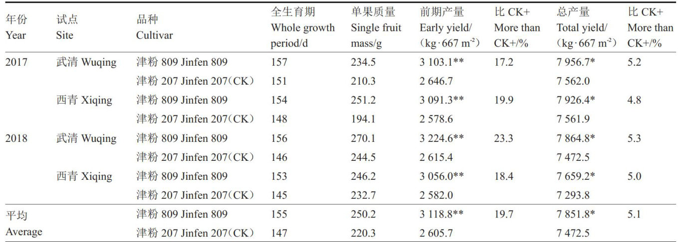 摘要:津粉809是以自交系17-648为母本、自交系19-139为父本配置而成的无限生长类型杂交1代番茄新品种。该品种生长势中等,节间较短,果实近圆形,无绿肩,成熟果粉红色,果脐小,精品果率高,单果质量 250g 左右,可溶性固形物含量 Π(μ) ,后同) 14.8% ,总酸含量 0.67% ,可溶性总糖含量 3.3% ,维生素C含量 73.7mg?kg-1 ,番茄红素含量 21.6mg?kg-1 。抗番茄黄化曲叶病毒(TYLCV)、烟草花叶病毒(TMV)和枯萎病。平均 677m2 早期产量3073.8kg ,平均 677m2 总产量 7625.3kg ,适合天津地区早春和越冬日光温室栽培。2022年通过农业农村部非主要农作物品种登记,2024年获得农业农村部植物新品种权保护。
