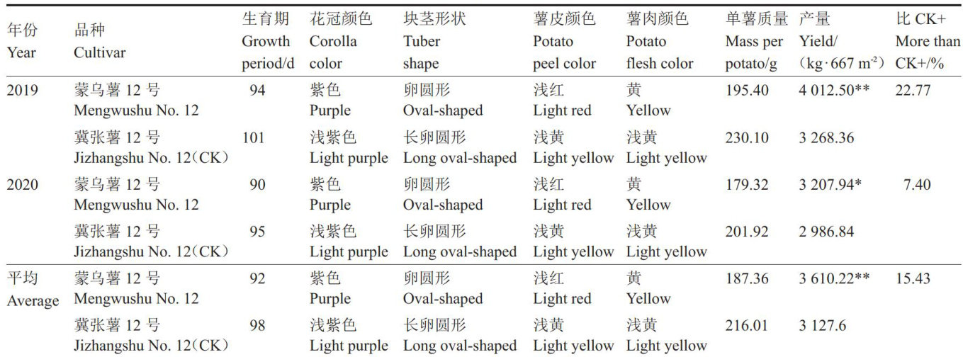 摘要:蒙乌薯12号是以中薯18号为母本、Kondor为父本杂交选育而成的鲜食型中晚熟马铃薯新品种。该品种生育期92d,株型半直立,株高约 85cm ,茎秆绿色局部带褐色,叶绿色,花冠紫色。块茎卵圆形,浅红皮黄肉,芽眼浅,结薯浅而集中,平均单株结薯7.80个,平均单薯质量 187.36g ,商品薯率 85% 以上。 667m2 产量可达 3500kg. 。该品种干物质含量 Ξ(w) 后同) 20.80% ,蛋白质含量 1.98% ,淀粉含量 13.20% ,维生素C含量 16.30mg?100g-1 ,还原糖含量 0.72% ,抗马铃薯X病毒(Potato virus X,PVX)和马铃薯Y病毒(Potato virusY,PVY),高感晚疫病。适宜在华北一作农业生态区,内蒙古呼和浩特、乌兰察布、包头、锡林郭勒盟,河北张家口,山西大同春播种植。2025年通过农业农村部非主要农作物品种登记。