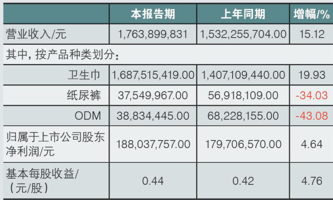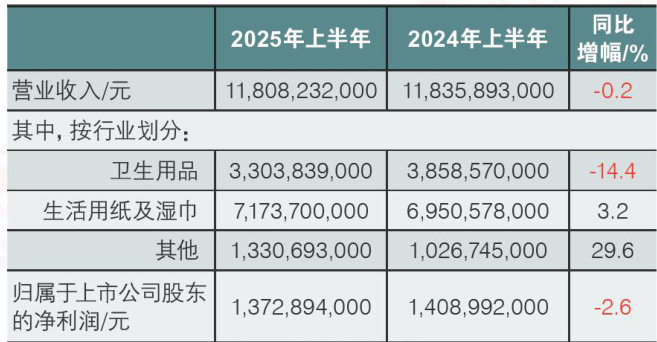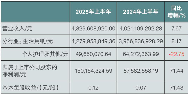 (本刊讯)8月20日,中顺洁柔纸业股份有限公司发布2025年半年度报告。报告显示,2025年上半年,公司营业收入约43.30亿元,同比增长 7.67% 。归属于上市公司股东的净利润约1.50亿元,较上年同期增长 71.44% 。基本每股收益0.12元/股,较上年同期增长 71.43% 。营业收入增长主要来自生活用纸业务,上半年中顺洁柔生活用纸业务收入42.80亿元,占总营业收入的 98.85% 。