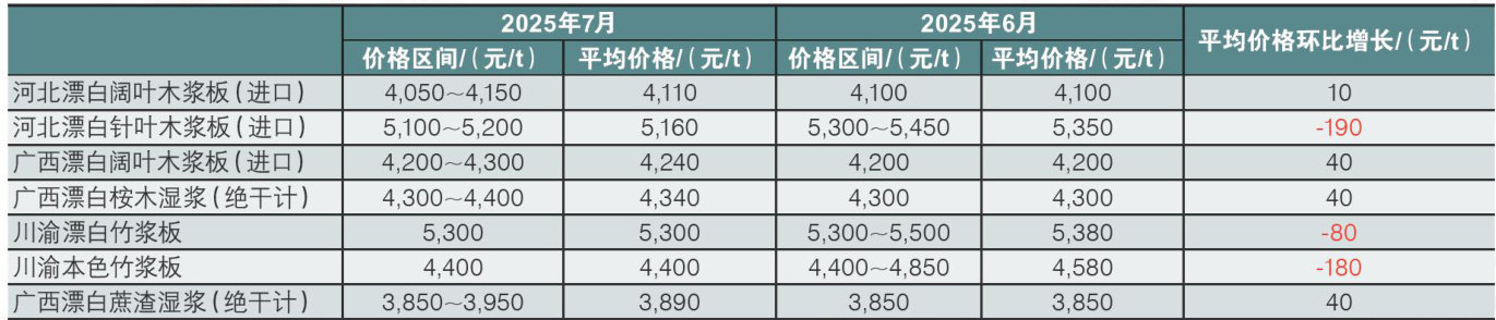 (本刊讯)据《生活用纸》杂志调研数据,2025年7月川渝漂白竹浆板和本色竹浆板平均价格均仍延续6月下降趋势,河北漂白针叶木浆板(进口)平均价格也有所下降,且降幅较大,较上月下降190元/t。其他生活用纸主要区域市场纸浆平均价格略有上涨。 2025年7月纸浆价格变化情况具体如下: 木浆原料中,河北漂白阔叶木浆板(进口)平均价格上涨10元/t,为4,110元/t。河北漂白针叶木浆板(进口)平均价格