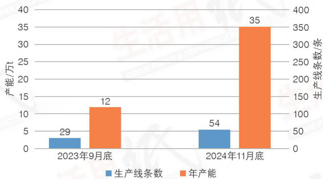 2024年,我国国民经济总体平稳、稳中有进,据国家统计局数据显示,全年国内生产总值(GDP)达135万亿元,同比实现 5.0% 的增长。 2024年,中国生活用纸行业继续保持增长,行业产能进一步释放,新投产产能达164.8万t,仍为历史较高水平,同时也有落后产能的淘汰和部分现代化纸机停产。 2024年中国生活用纸装机总产能达到2,126.7万t,比上年增长 4.4% ;市场规模达到1,550.