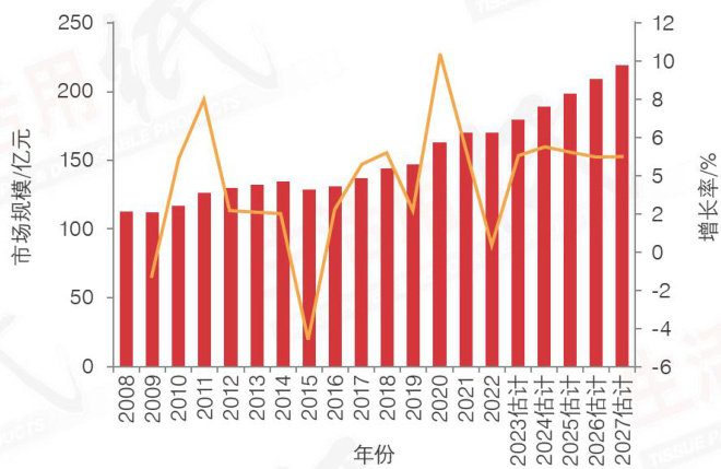 中国湿厕纸行业经过15年的高速发展,尤其是从2020年起近5年的市场爆发后,进入市场激烈竞争阶段。近5年来,湿厕纸产品技术有了长足的进步,多项指标大幅提升,也给消费者带来明显的体验改善。各品牌在保证品质前提下市场充分竞争。本文将介绍作为湿厕纸基材的可冲散性非织造布,在工艺与性能方面的提升 1 可冲散非织造布市场和产能情况 2020年底,中国湿厕纸年销售额不足10亿元,使用非织造布量约8,00