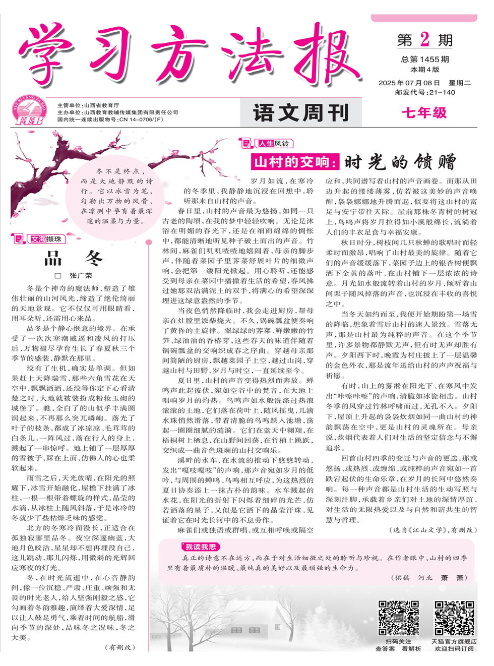 阅读下面的文字,完成(1)~(3)题。 寒露镶玉,霜降点枫,时令的脚步悄然迈向立冬——今年的冬之始章将在11月7日徐徐展开。自古以来,文人墨客大多对冬季( )。老舍先生笔下的《济南的冬天》,便以温润的笔触,为我们勾勒出一幅别具韵味的冬日。那秀气的小山、澄清的河水,皆是寒冬里令人心安的存在。 我们总在期盼这样一个冬日的到来——静坐于窗前,看雪花纷纷扬扬地zhù蓄着天地间的静谧,所有的喧嚣都