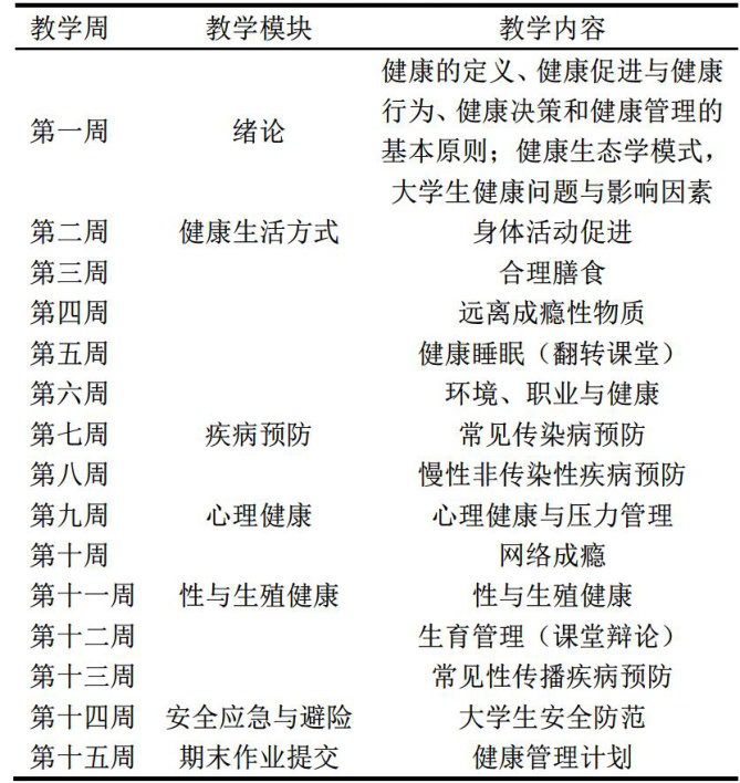 摘要:围绕《普通高等学校健康教育指导纲要》,设计并实施大学生健康教育与健康管理课程,以提升大学生健康素养。以教授学生管理健康的技能为主线,针对《普通高等学校健康教育指导纲要》中提出的核心内容,通过理论讲授结合实践活动、翻转课堂、课堂辩论等教学方式,促进学生了解健康知识,掌握健康管理技能,提升健康素养。学生能够较好完成期末个人健康管理方案设计,切实掌握健康管理技能,提升健康素养。同时,学生对课程满意度较高。大学生健康教育与健康管理课程设计合理,满足学生的健康教育需求,教学质量较高,能够切实提高学生的健康素养。
