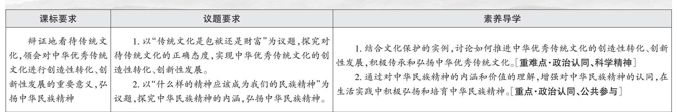 [教材“阅读与思考1”] 【引思】我们应该如何继承和弘扬中华优秀传统文化? 【导学】 1.对于传统文化要坚持古为今用,去粗取精、去伪存真,经过科学的扬弃后使之为我所用:要使中华民族最基本的文化基因与当代文化相适应、与现代社会相协调,以人们喜闻乐见、具有广泛参与性的方式推广开来,把跨越时空、超越国度、富有永恒魅力、具有当代价值的文化精神弘扬起来,把既继承优秀传统文化又弘扬时代精神、既立足本