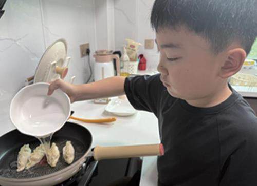 每个清晨,妈妈都会为我精心准备早餐,为了减轻她的负担,我决定要学会自己做早餐,那就从锅贴饺子开始吧。 准备食材:饺子、鸡蛋、小葱、芝麻。 步骤一:在平底锅中倒入少许油,然后把饺子整齐地摆放在锅里,倒上水,注意水要没过饺子。这时候的饺子就像一艘艘浸在水里的小船一样。开火煮饺子。 步骤二:趁煮饺子的时间,打一个鸡蛋备用。 步骤三:锅里的水慢慢烧干,发出轻微滋滋声时,倒入蛋液、撒上葱花、再撒一点