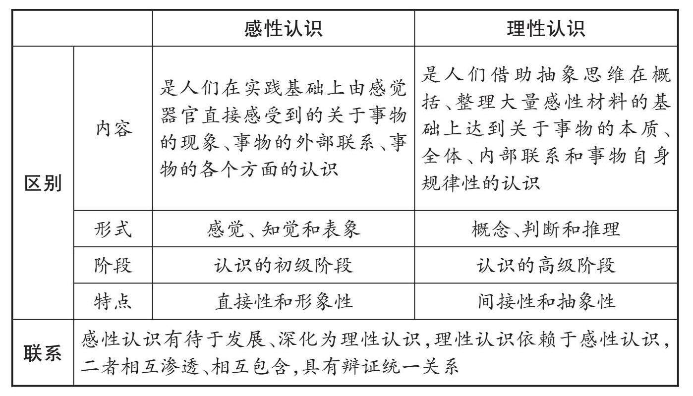 重难突破 1.认识的含义及分类 (1)含义 认识是主体对客体的能动反映。 (2)分类 感性认识和理性认识是人们对客观世界的两种不同水平的反映形式,也是认识过程的两个不同阶段。 2.实践的含义、基本形式及特点 (1)含义 实践是人们改造客观世界的物质性活动。 (2)基本形式 改造自然的生产实践、变革社会的实践、探索世界规律的科学实验活动等。其中,生产实践是人类最基本的实践活动。