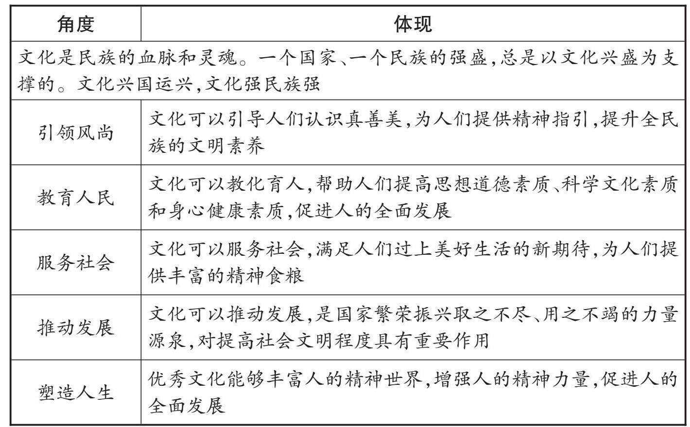 重难突破 1.文化的内涵与功能 (1)内涵 一般来说,文化一词有广义和狭义两种理解。广义的文化是指人类认识和改造世界的一切活动及其创造的物质成果和精神成果。狭义的文化是相对于经济、政治而言的人类的全部精神现象,既包括世界观、人生观、价值观等具有意识形态性质的内容,又包括自然科学和技术等非意识形态的内容。 (2)功能 [角度 体现 文化是民族的血脉和灵魂。一个国家、一个民族的强盛,总是以文