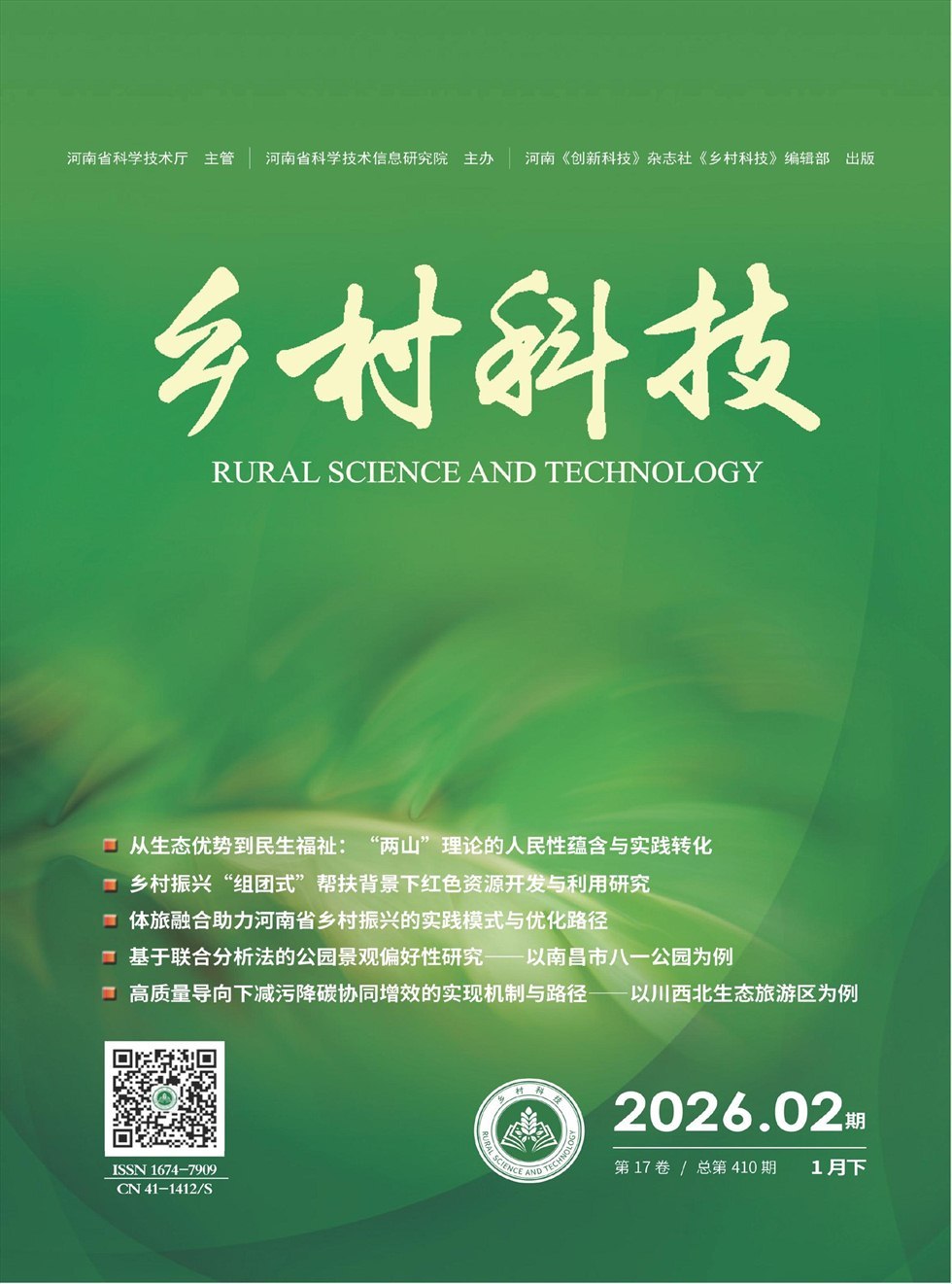 《乡村科技》是经国家新闻出版署批准,由河南省科技厅主管,面向国内外公开发行的一本优秀农业科技刊物,荣获2013年度河南省自然科学一级期刊。本刊主要栏目有:三农论坛(管理、综述、推广、教育)、农业经济(经济类非技术文章)、园林绿化(林业、景观、绿化)、种植大观(种植技术、植保、瓜果蔬菜)、养殖技术(养殖技术、水产、渔业、兽医)、资源与环境(土肥、能源、水污染、气象)、农业工程(环保、信息化、农机)。