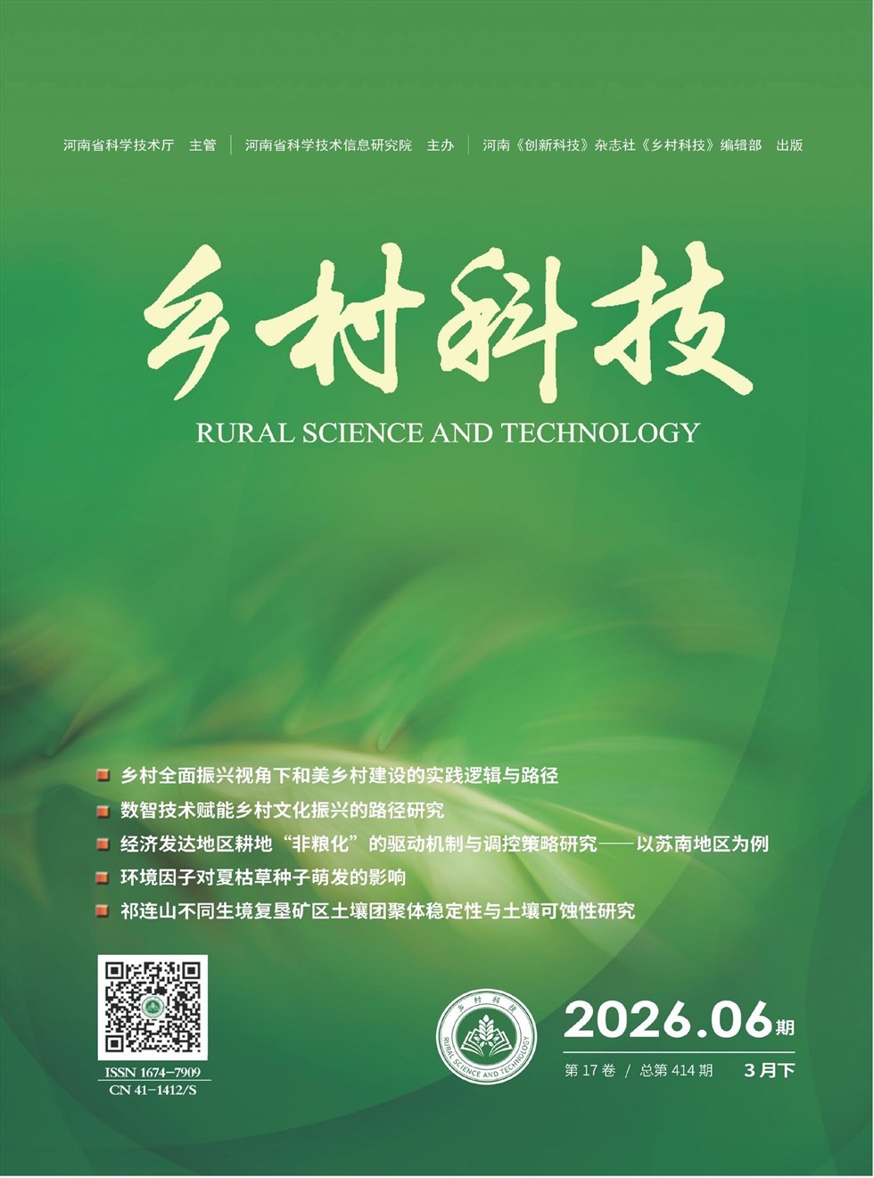 《乡村科技》是经国家新闻出版署批准,由河南省科技厅主管,面向国内外公开发行的一本优秀农业科技刊物,荣获2013年度河南省自然科学一级期刊。本刊主要栏目有:三农论坛(管理、综述、推广、教育)、农业经济(经济类非技术文章)、园林绿化(林业、景观、绿化)、种植大观(种植技术、植保、瓜果蔬菜)、养殖技术(养殖技术、水产、渔业、兽医)、资源与环境(土肥、能源、水污染、气象)、农业工程(环保、信息化、农机)。