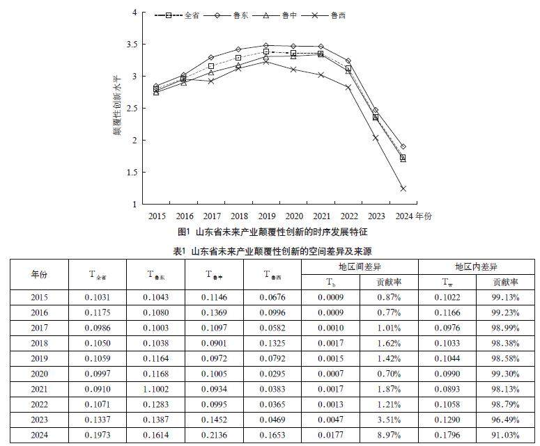 摘 要:未来产业作为以科技创新为驱动力的新兴产业,其颠覆性创新是培育和发展新质生产力的内在要求。本文以2015—2024年山东省16个地级市96家未来产业上市企业为样本,运用Theil指数、ESDA等方法考察未来产业颠覆性创新的时空演化特征,并结合空间计量模型探究未来产业颠覆性创新的关键影响因素。结果表明:未来产业颠覆性创新水平总体呈波动下降态势,存在区域差异,且差异逐步扩大,地区内差异是总体差异